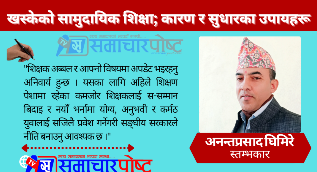 अहिलेको सन्दर्भमा शिक्षाको महत्त्व खासै नबुझेका, अतिविपन्न परिवारका बालबालिकाहरू मात्र सामुदायिक विद्यालयमा अध्ययन गर्छन् । हुनेखाने परिवार, व्यापारी, कर्मचारी, नेता तथा शिक्षकका सन्तान संस्थागत विद्यालयमा अध्ययन गर्छन् । पछाडि परेका समुदायका अधिकांश बालबालिका सामुदायिक विद्यालयमा अध्ययन गर्ने गरेकाले उनीहरू विद्यालयमा गई सोधखोज गर्नुभन्दा दुई छाक खानाको जोहो गर्नमा व्यस्त रहन्छन् । विद्यालय नियमित सञ्चालन भइरहेको छ/छैन? शिक्षक कक्षाकोठामा गएर पढाए/पढाएनन्? आफ्ना बालबच्चाको शैक्षिक उपलब्धि के-कस्तो रहेको छ जस्ता विषयमा सोधखोज नगरिएकोले पनि सार्वजनिक शिक्षामा अपेक्षित उपलब्धि हासिल हुन सकेको छैन । जसका कारण संस्थागत विद्यालयहरू फस्टाउँदै गएका हुन् । सामुदायिक विद्यालयको शैक्षिकस्तर सुधार गर्न राज्यको ढुकुटीबाट तलब सुविधा पाउने सबै कर्मचारी, शिक्षक तथा नेताहरूका सन्तानलाई सामुदायिक विद्यालयमा ल्याउने शिक्षा ऐन, कानून तथा नीति–नियम अवलम्बन गर्न ढिलाइ गर्नु हुदैन ।